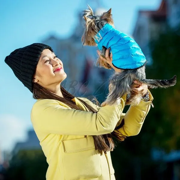 Ľahká, teplá obojstranná vesta pre malé plemená psov v modro-zelenej farbe.