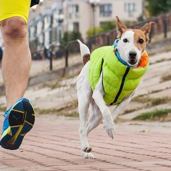 Ľahká, teplá obojstranná vesta pre malé plemená psov v oranžovo-zelenej farbe.