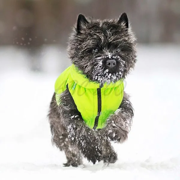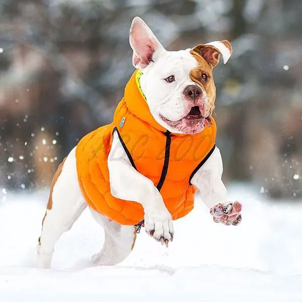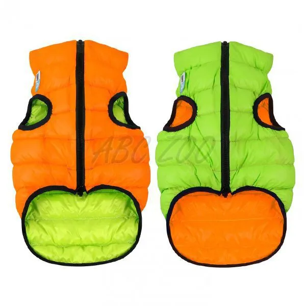 Ľahká, teplá obojstranná vesta v oranžovo-zelenej farbe, ideálna pre malé plemená psov so širším krkom a hrudníkom.