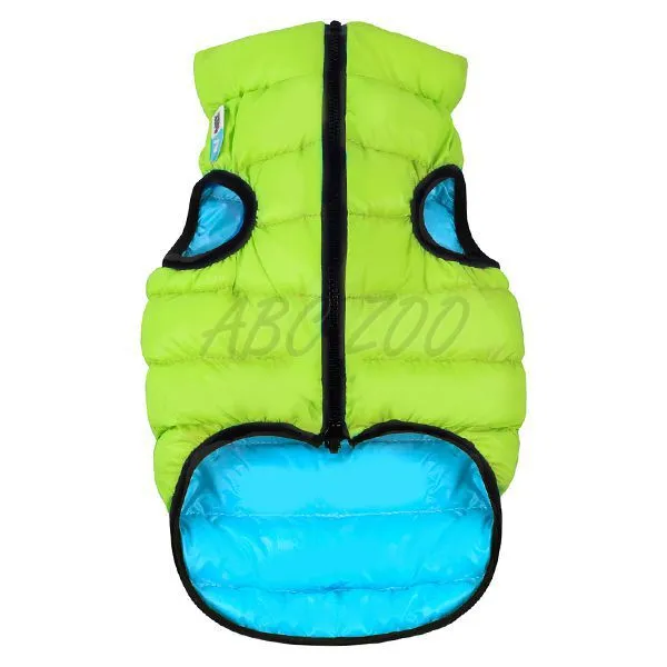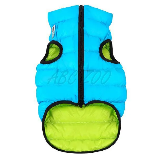 Ľahká, teplá obojstranná vesta v modro-zelenej farbe, ideálna pre malé plemená psov so širším krkom a hrudníkom.
