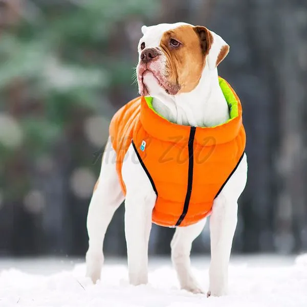 Ľahká, teplá obojstranná vesta pre malé plemená psov v oranžovo-zelenej farbe.