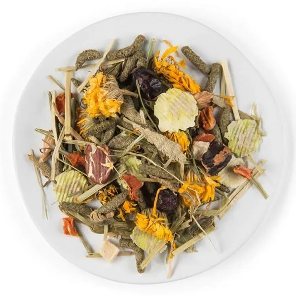 Zloženie: vedľajšie produkty rastlinného pôvodu (4 % timotejka, 3 % nechtík, 0,2 % žihľava), zelenina (1 % paprika), zrná, ovocie (4 % šípky), oleje a tuky, minerály
