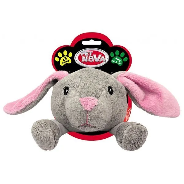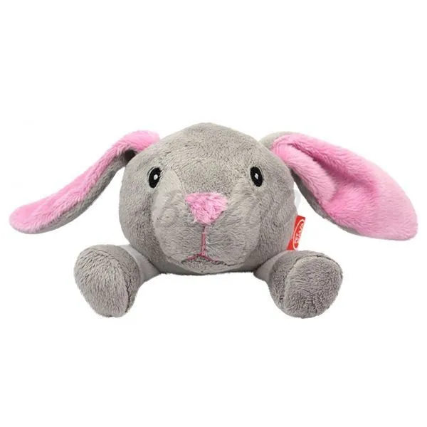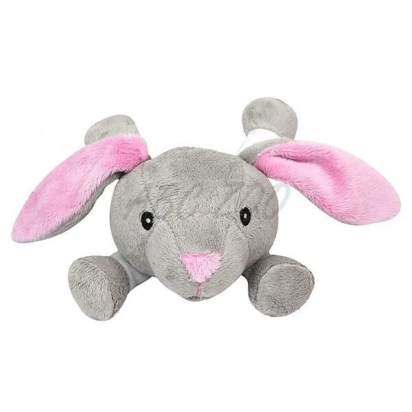 Zajac z mäkkého plyšu, s tvrdým pískajúcim vankúšikom zabudovaným v tele hračky.