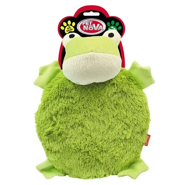 Plyšová hračka pre psa v podobe žabky, s pevným kruhovým telom a píšťalkou vo vnútri.