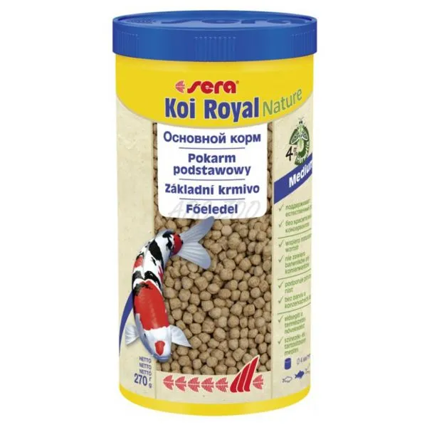 Sera KOI ROYAL je základné krmivo podporujúce rast a zdravie všetkých dospievajúcich koi kaprov. Vďaka dobrej stráviteľnosti sa ideálne hodí pre skrmovanie behom celého roka.  Vyvážený obsah prírodných minerálov, stopových prvkov a pridávaných vitamínov podporuje imunitu a vitalitu koi kaprov. Sera KOI krmiva sú perfektne prospôsobené potrebám koi kaprov. Tri veľkosti granúl MINI, MEDIUM a LARGE odpovedajú rôznym vývojovím etapám koi kaprov: malý a rastúci koi dostanú krmivo MINI, stredne veľký sú krmený MEDIUM, pre veľkých koi kaprov doporučujeme veľkosť LARGE.