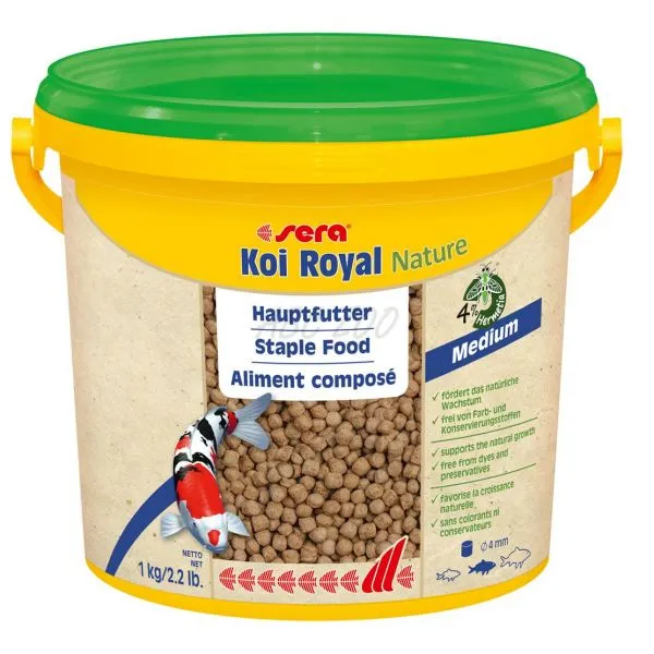 Sera KOI ROYAL je základné krmivo podporujúce rast a zdravie všetkých dospievajúcich koi kaprov. Vďaka dobrej stráviteľnosti sa ideálne hodí pre skrmovanie behom celého roka.  Vyvážený obsah prírodných minerálov, stopových prvkov a pridávaných vitamínov podporuje imunitu a vitalitu koi kaprov. Sera KOI krmiva sú perfektne prospôsobené potrebám koi kaprov. Tri veľkosti granúl MINI, MEDIUM a LARGE odpovedajú rôznym vývojovím etapám koi kaprov: malý a rastúci koi dostanú krmivo MINI, stredne veľký sú krmený MEDIUM, pre veľkých koi kaprov doporučujeme veľkosť LARGE.