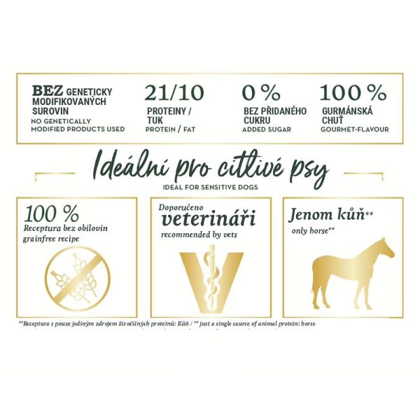 Bezobilné, prémiové krmivo pre dospelé psy stredných a veľkých plemien, s konským mäsom - ideálne pre citlivé a alergické jedince. Viac detailov