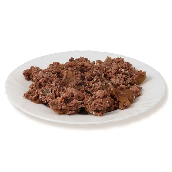 Zloženie: hovädzie (mäso, pečeň, pľúca, srdce, obličky, vemeno) 50 %, morčacie srdcia 15 %, uhličitan vápenatý
