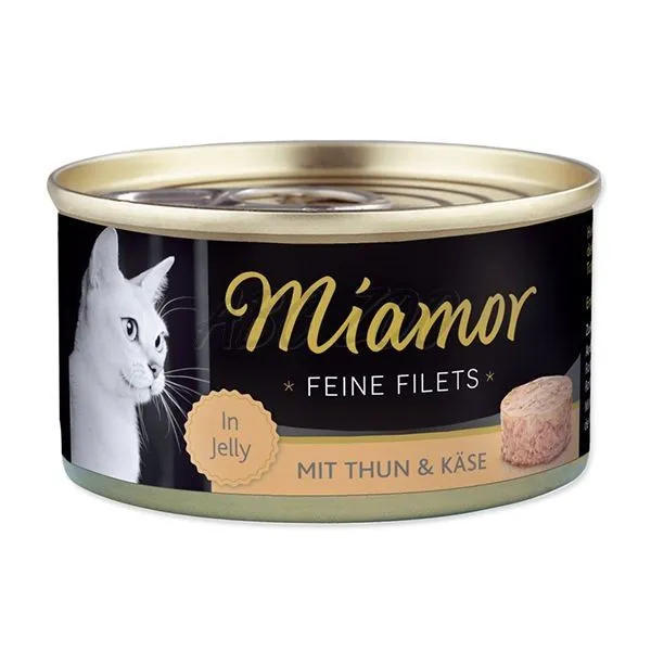 Konzerva s kúskami tuniaka a syra v lahodnom želé pre dospelé mačky všetkých plemien.