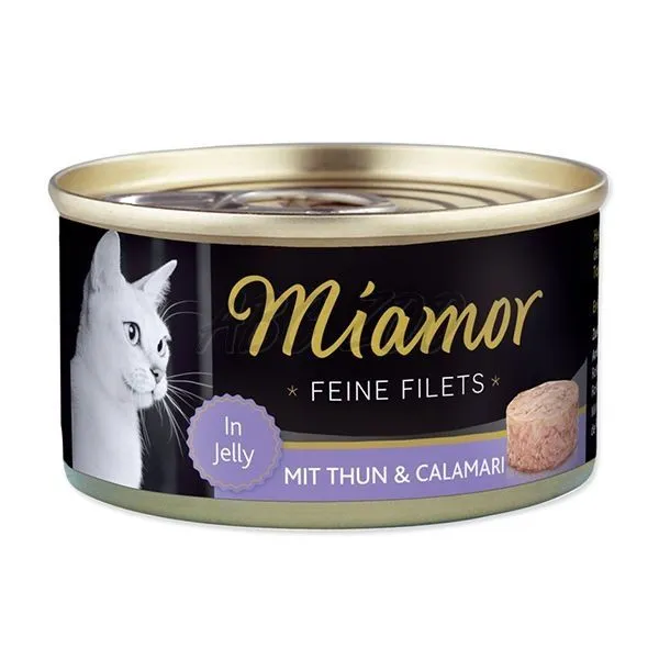 Konzerva s kúskami tuniaka a kalmármi v lahodnom želé pre dospelé mačky všetkých plemien.
