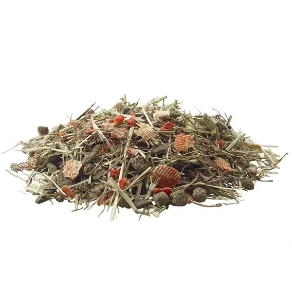 Zloženie: vedľajšie produkty rastlinného pôvodu (trávy a byliny 28 %, Timotejka lúčna, Reznačka laločnatá, Mätonoh trváci, Lipnica lúčna, Kostrava lúčna, Kostrava trsťovitá, Ďatelina plazivá, Ďatelina lúčna, Psiarka lúčna, Skorocel kopiový, Púpava lekárska, Rebríček obyčajný), zelenina (hrášok 12,7 %, mrkva 8 %), ovocie, semená, rastlinne bielkovinové extrakty, minerálne látky, oleje a tuky, FOS, nechtík lekársky, MOS, riasy, juka