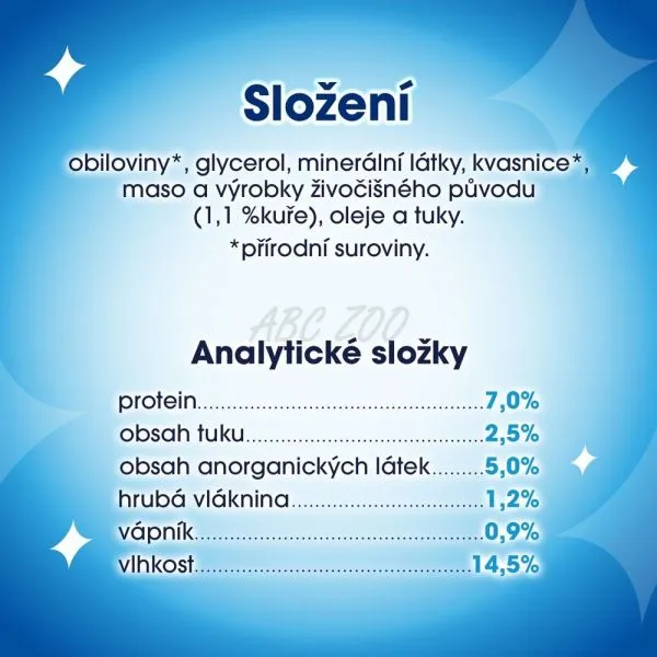 Zložky: obilniny (60 % extrudovaná kukuričná múka, 5 % pšeničná múka), glycerín, minerálne látky, droždie, mäso a vedľajšie živočíšne produkty 1,2 % zodpovedá 4 % rehydratovaného mäsa a vedľajších živočíšnych produktov (4 % kuracie), oleje a tuky