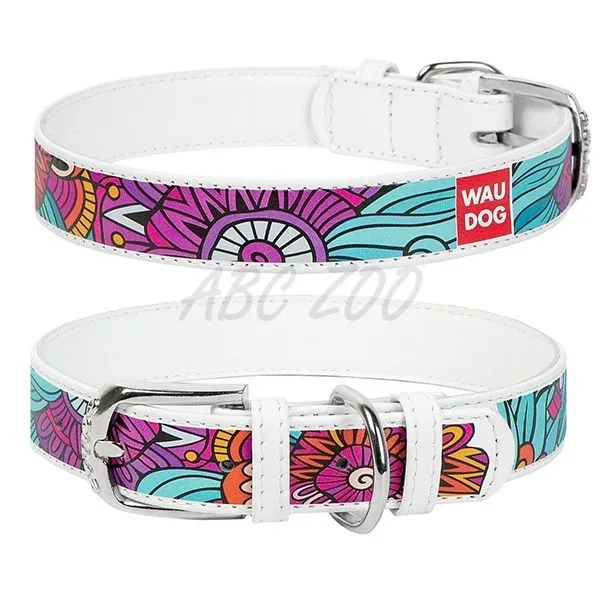 Obojok bielej farby s farebným vzorom vyrobený z kože. Viac detailov
