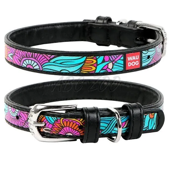 Kožený obojok čiernej farby s farebnou laserovou potlačou. Viac detailov