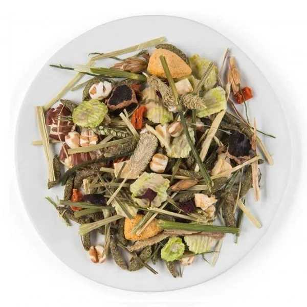 Zloženie: deriváty rastlinného pôvodu (4 % timotejka lúčna), zelenina (9,5 % hrášok, 2 % kôpor, 2 % červená repa), zrná, ovocie (2 % papája), oleje a tuky, minerály