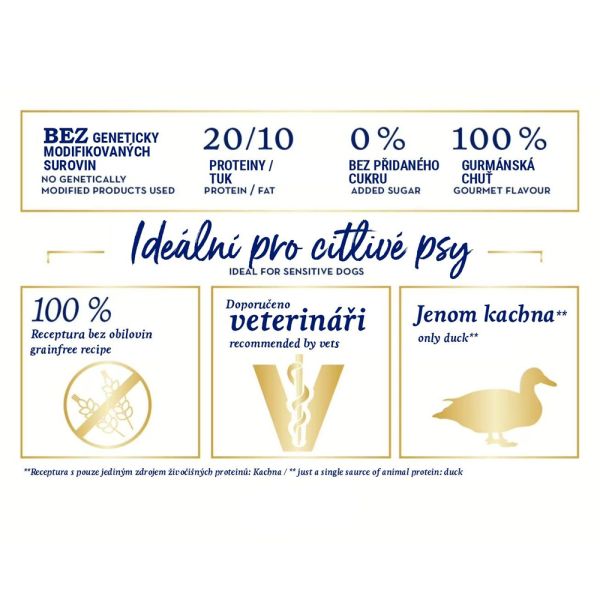• monoproteínové krmivo - obsahuje len 1 druh mäsa - kačku