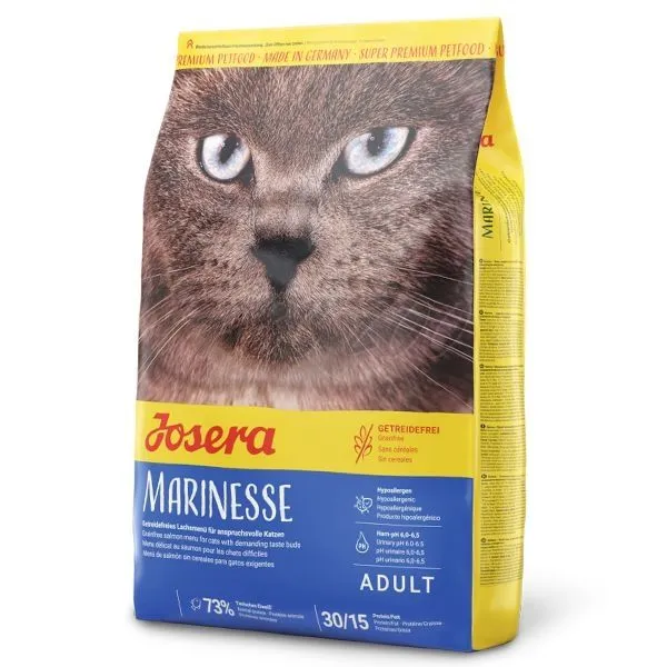 Zloženie: lososová múčka 30 %, ryža, zemiaky, hydinový tuk, hrachová múka, zemiakové bielkoviny, repné rezky, hydrolyzované rybie bielkoviny, minerály