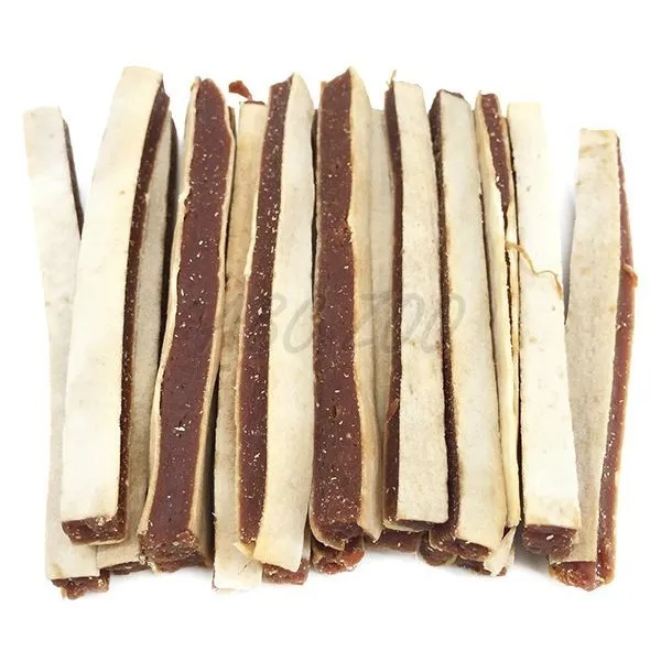 Mäsová odmena pre psy s lososom a treskou, vo forme dlhých pásikov.
