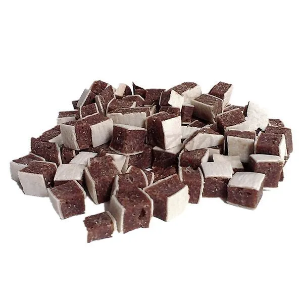 Mäsová odmena pre menšie psy a mačky s králičou pečeňou a treskou, vo forme sendvičových mini kociek.