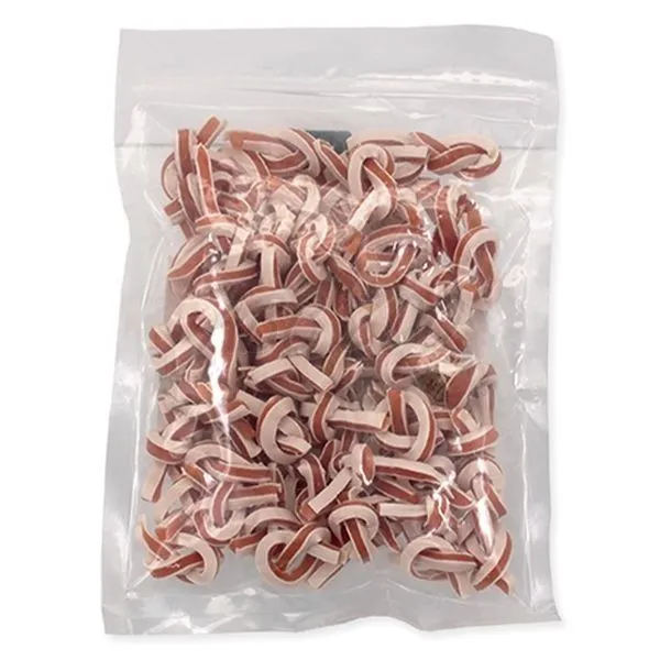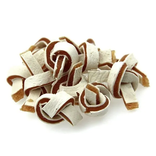Mäsová odmena pre psy s kuracinou a treskou, vo forme dlhých pásikov zmotaných do uzlíkov.