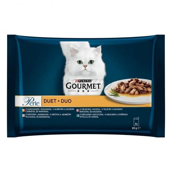 Gourmet Perle DUO kapsičky pre mačky kura a hovädzie, morka a jahňacie, teľacie a kačica, králik a divina 4x85 g