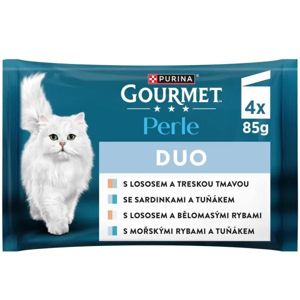 Gourmet Perle DUO kapsičky pre mačky losos a treska, morské ryby a tuniak, losos a ryby, sardinky a tuniak 4x85 g