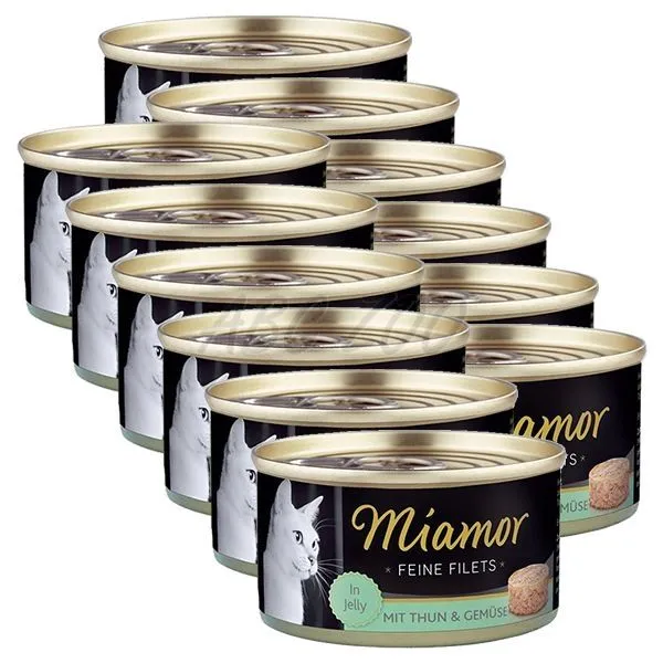 Konzerva s kúskami tuniaka a zeleniny v lahodnom želé pre dospelé mačky.