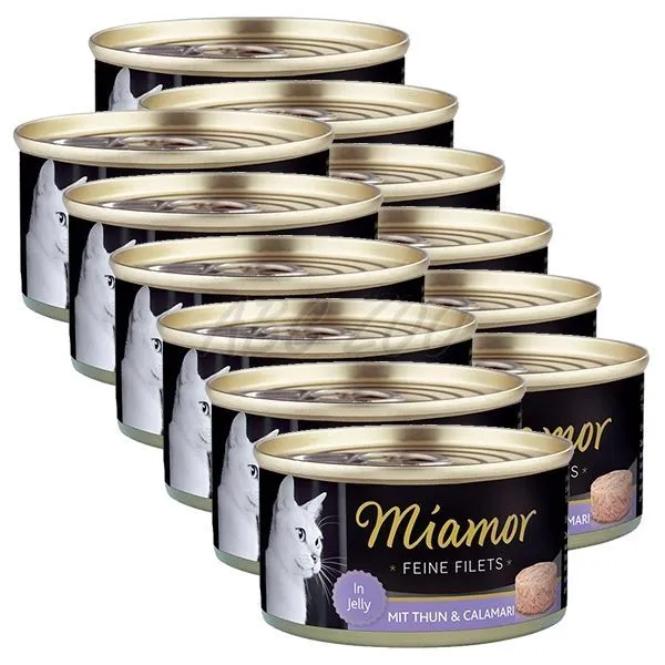 Konzerva s kúskami tuniaka a kalmárov v lahodnom želé pre dospelé mačky.