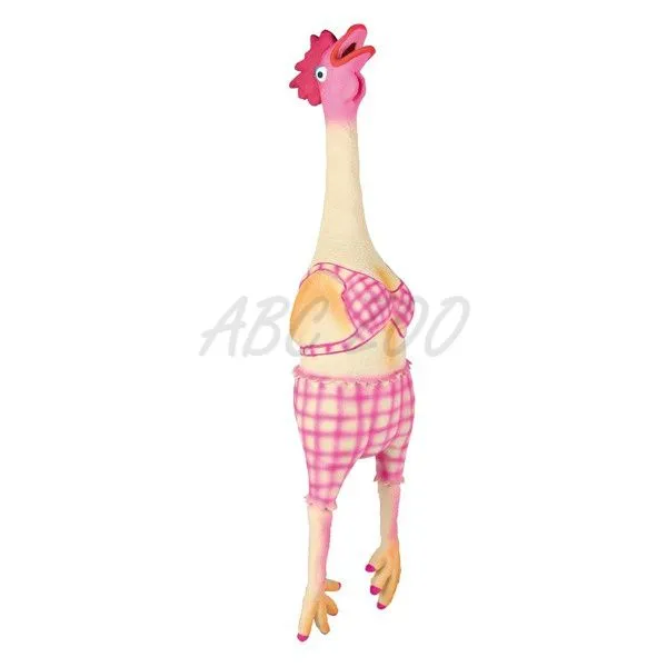 Gumená, pískajúca sliepka pre psa s originálnym ružovým oblečením.