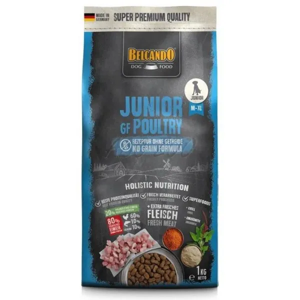 Bezobilné, super prémiové krmivo s vysoko stráviteľnou hydinou pre mladé psy stredných a väčších plemien s intoleranciou lepku, alebo alergiou na obilniny.