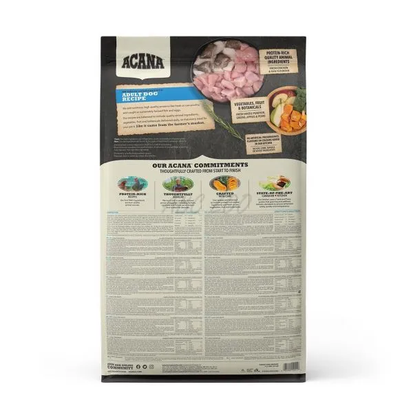 Granule Acana Adult sú plné čerstvých miestnych surovín, ako je voľne chovaná hydina, vajcia z voľného chovu, ryby z prírodných lovov a na slnku zrejúce ovocie a zelenina. Všetky tieto výživné suroviny dodávajú krmivu chuť a zaisťujú vrcholovú kondíciu malých plemien.