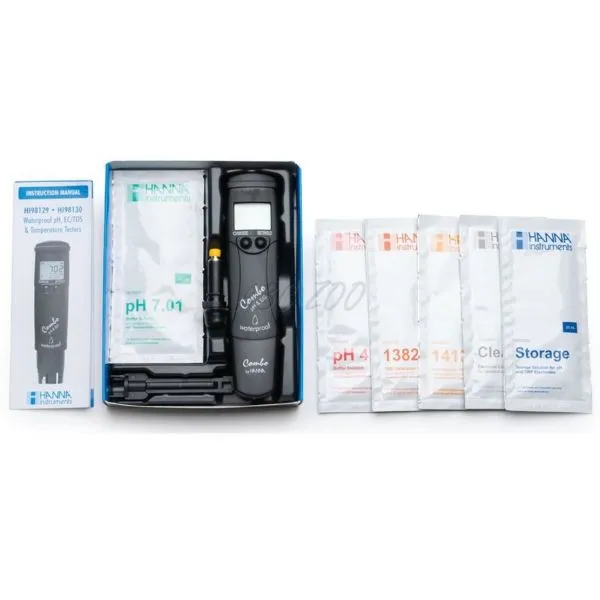 Obsah balenia: Tester HI98129, nástroj na výmenu elektród, kalibračné roztoky 1x20 ml 4,01 pH, 1x20 ml 7,01 pH, 1x20 ml 1413 uS/cm, 1x20 ml 1382 ppm, 1x20 ml čistiaci roztok, 1x20 ml storage roztok, batéria, návod