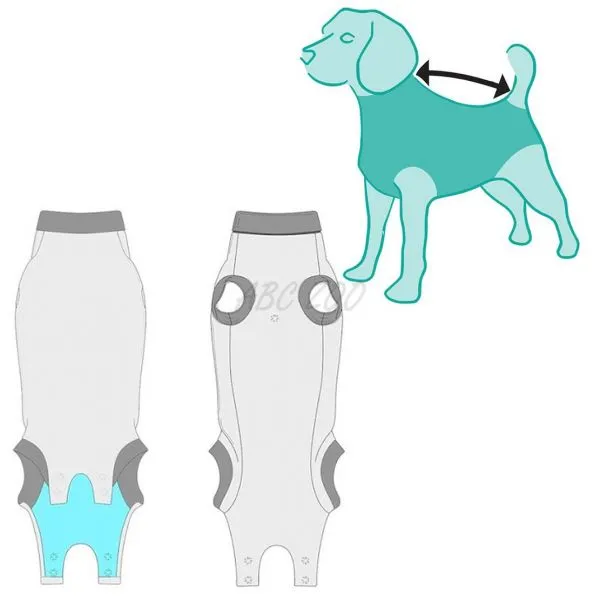 • mäkký, elastický a ochranný pás okolo predných, zadných končatín a okolo chvosta zaisťuje, že Recovery Suit® sa do kože nezarezáva, psy sa tak môžu pohybovať