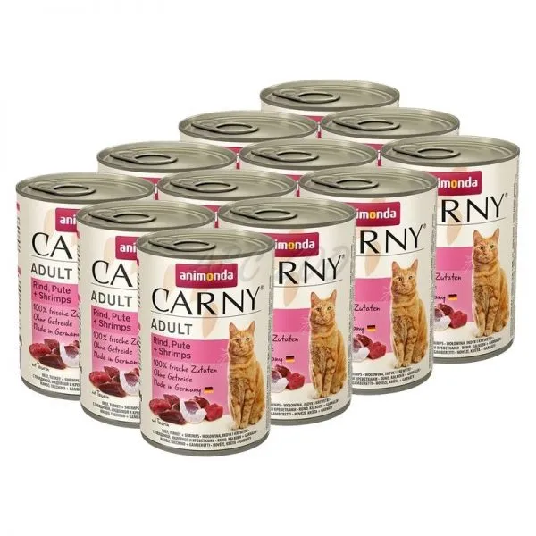 ANIMONDA CARNY ADULT mäsová konzerva pre dospelé mačky  s hovädzím, morčacím mäsom a krevetami.