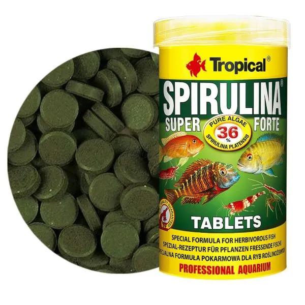 Rastlinné krmivo vo forme samolepiacich tabliet s vysokým obsahom rias (36 %) Spirulina platensis pre hlbinné bylinožravé ryby, mladé africké cichlidy, sladkovodné a morské kôrovce.