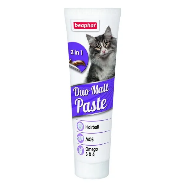 Duo Malt Pasta 2 v 1 podporuje odstránenie nahromadených chlpov v tráviacom trakte a podporuje zdravú črevnú mikroflóru.