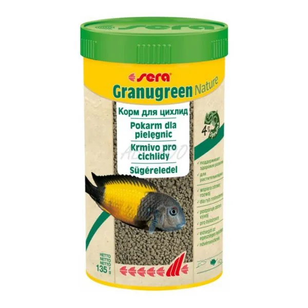 sera GRANUGREEN krmivo pre rastlinožravé cichlidy z jazier Malavi a Tanganika obsahuje rybí protein, pšeničné klíčky, obilné suroviny, spirulinu, bio-byliny, rybí tuk, rastlinný olej, a cukor.