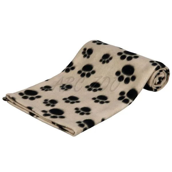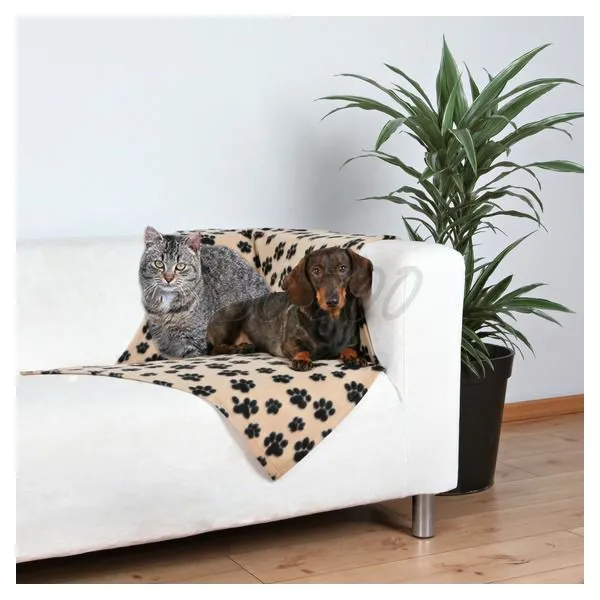 Béžová deka s čiernymi labkami pre psov a mačky na ochranu nábytku pred chlpmi.