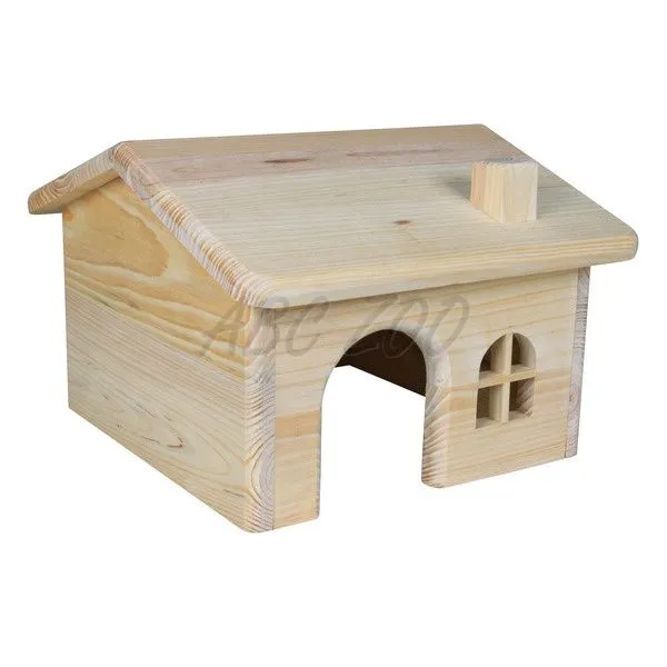 Domček pre hlodavce z kvalitného borovicového dreva - hranatý so šikmou strechou, okienkom a komínom.