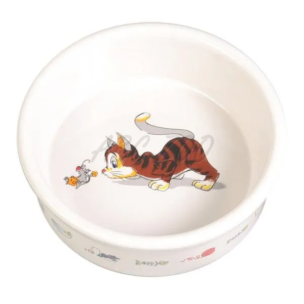 Keramická miska pre mačku s obrázkami denného režimu mačky.