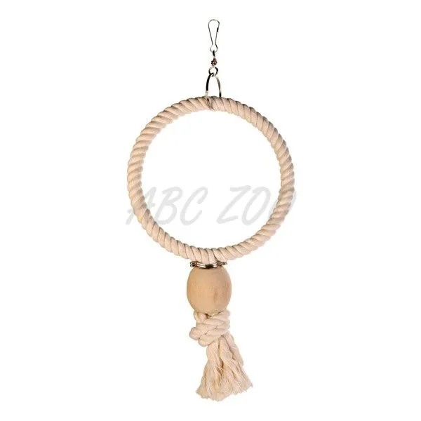 Pevný kruh, na zavesenie do klietky pre vtáky, vytvorený z bavlneného lana s veľkou drevenou korálkou.
