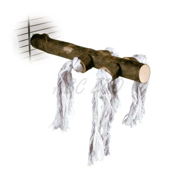 Bidlo pre vtáky z drevených kolíkov s visiacim bielym bavlneným lanom, so skrutkou na prichytenie o klietku.
