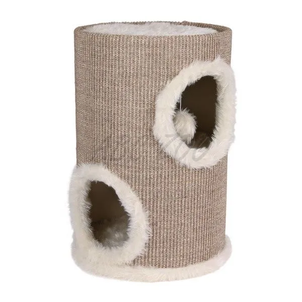 Sisalová, dvojposchodová veža s hračkou vo vnútri, s otvormi po bokoch aj vo vnútri, z vnútornej strany plyš, z vonkajšej sisal.