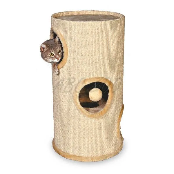 Sisalová, trojposchodová veža s hračkou vo vnútri, s otvormi po bokoch aj vo vnútri, z vnútornej strany plyš, z vonkajšej sisal.