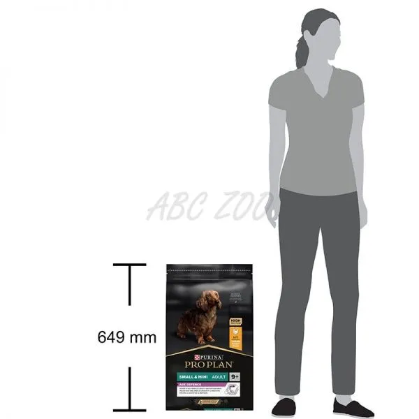 Krmivo Purina PRO PLAN® Age Defence SMALL&MINI ADULT 9+ bolo vyvinuté pre staršie psy malých a trpasličích plemien (s hmotnosťou nižšou ako 10 kg). Granuly obsahujú vitamín D, minerálne látky a špecifické množstvo omega-3 mastných kyselín (0,3 %), ktoré pomáhajú podporovať zdravé zuby a ďasná. Krmivo obsahuje vysoký podiel kvalitného kuraťa a s upraveným obsahom bielkovín a tuku poskytuje optimálnu výživu starším psov od 9 rokov.