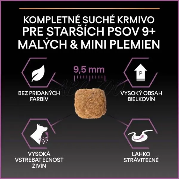 Purina PRO PLAN PUPPY Small and Mini Adult 9+ je kompletné krmivo pre malých a trpasličích psov všetkých plemien starších ako 9 rokov.