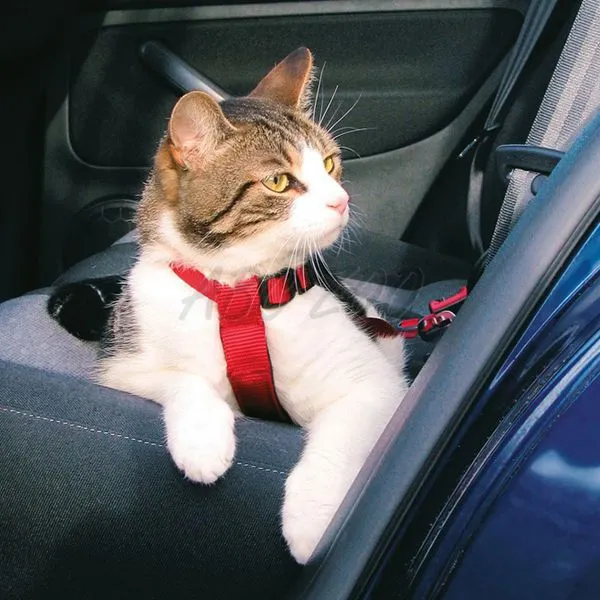 Postroj do auta pre mačky bezpečnostný, červenej farby. Viac detailov