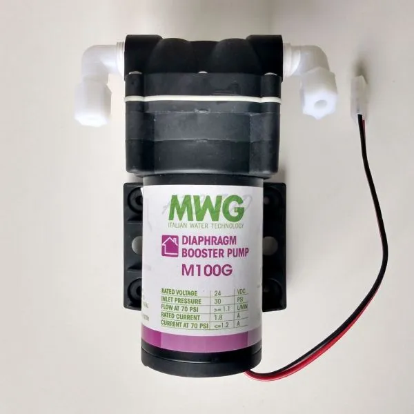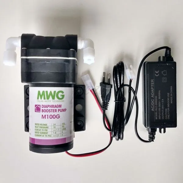 Pomocné čerpadlo je nevyhnutné na správnu funkciu membrány reverznej osmózy všade tam, kde je tlak vody menší ako 3 Bar. Po zapojení čerpadla dochádza k značnému nárastu výkonu reverznej osmózy a výrazne sa zníži množstvo odpadovej vody. Zariadenie je napájané elektrickou energiou z dodaného sieťového adaptéra s jednosmerným napätím (24V).