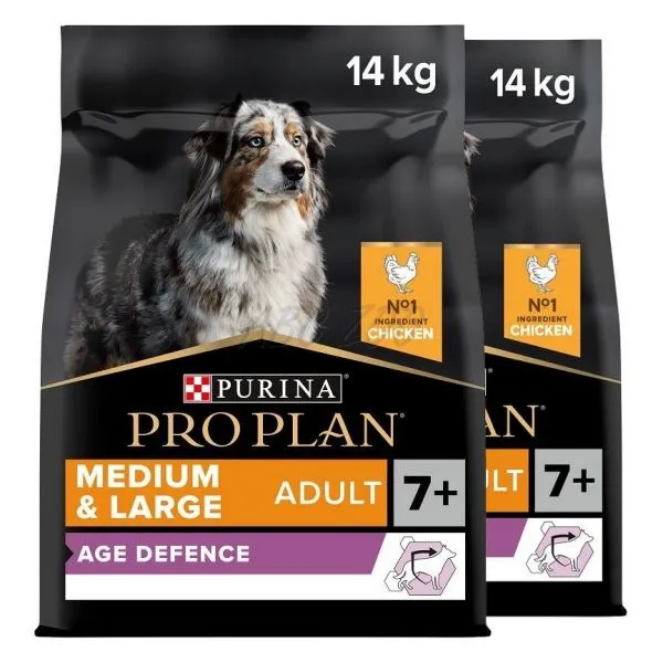 Krmivo Purina PRO PLAN® Age Defence MEDIUM&LARGE ADULT 7+ bolo vyvinuté pre staršie psy stredných a veľkých plemien (s hmotnosťou nad 10 kg). Granuly obsahujú vitamín D, minerálne látky a špecifické množstvo omega-3 mastných kyselín (0,3 %), ktoré pomáhajú podporovať zdravé zuby a ďasná. Krmivo obsahuje vysoký podiel kvalitného kuraťa a s upraveným obsahom bielkovín a tuku poskytuje optimálnu výživu starším psov od 7 rokov.