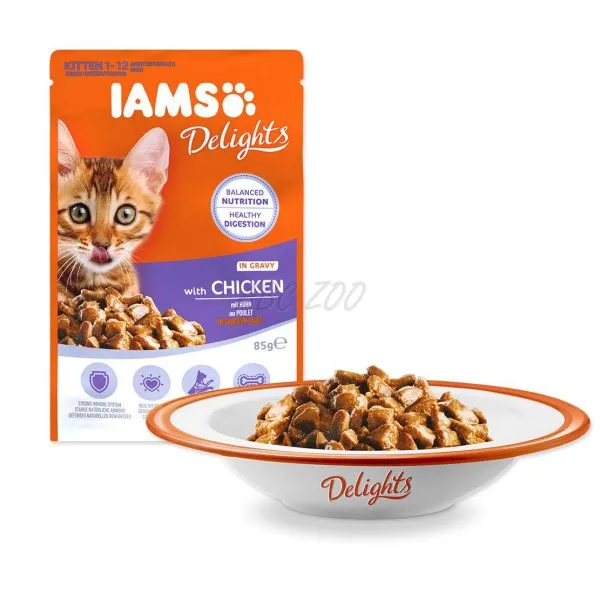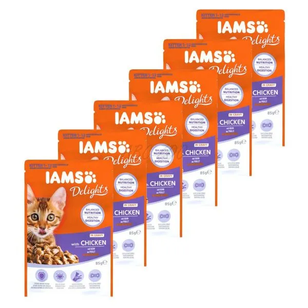 Iams kapsička pre mačiatka od 1-12 mesiacov s obsahom kúskov kuracieho mäsa v omáčke.
